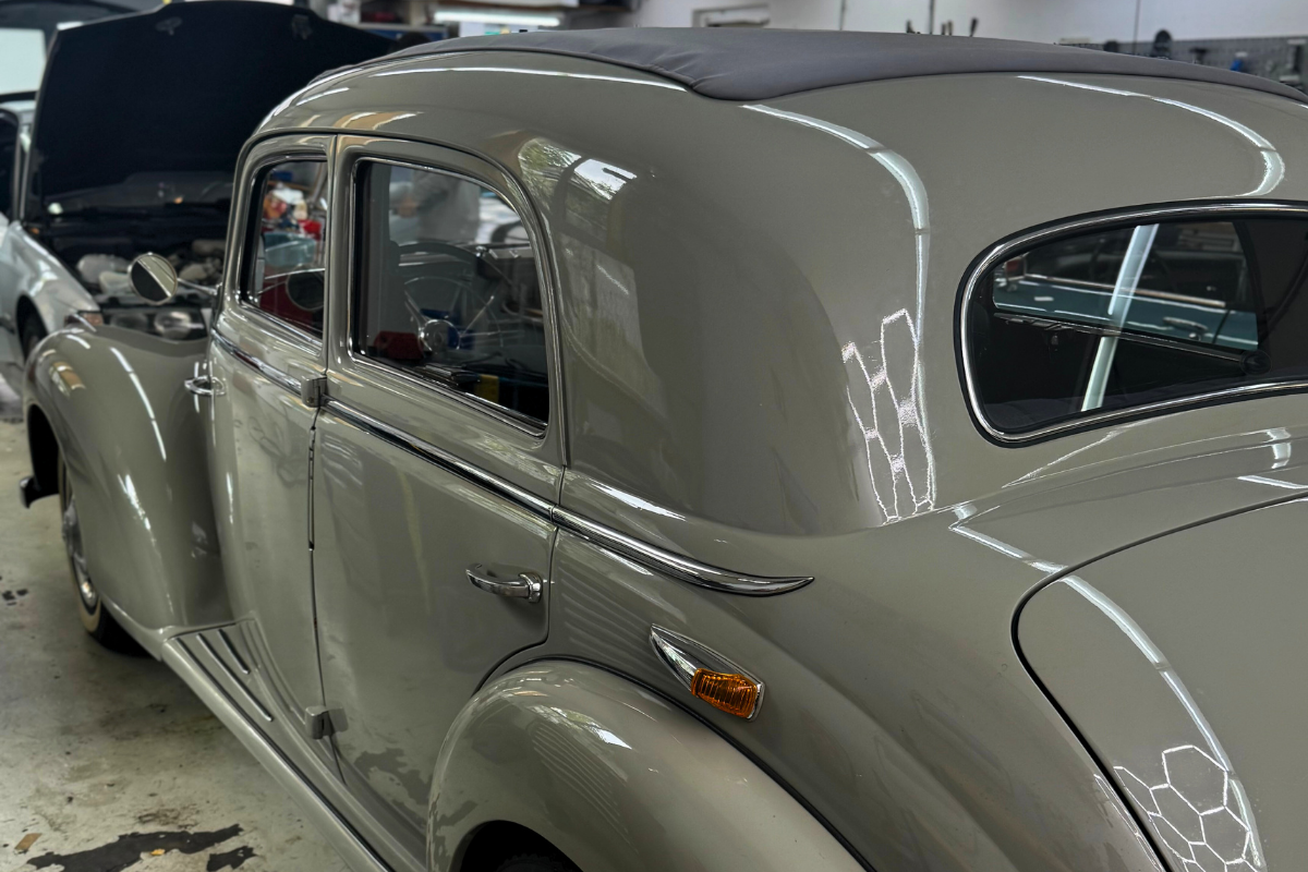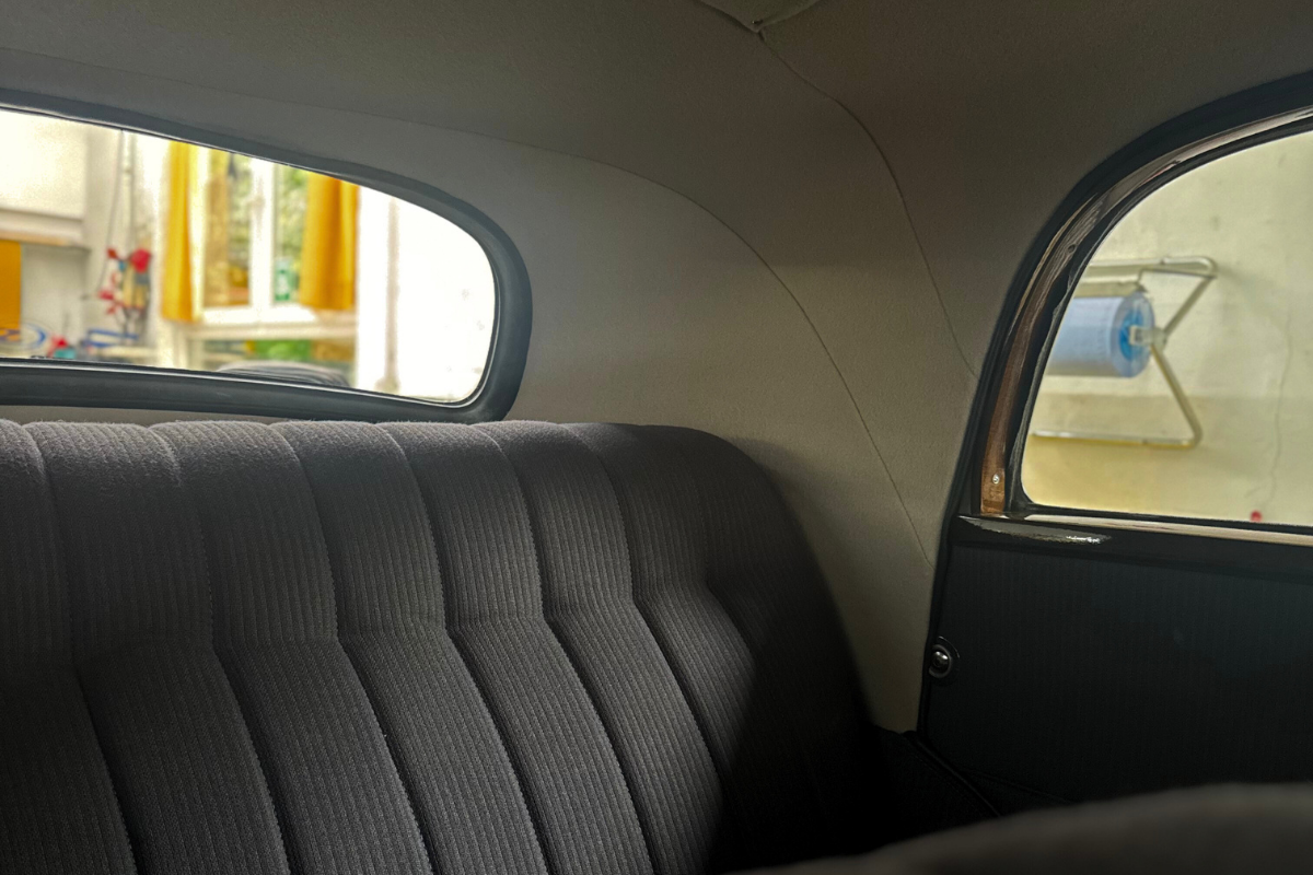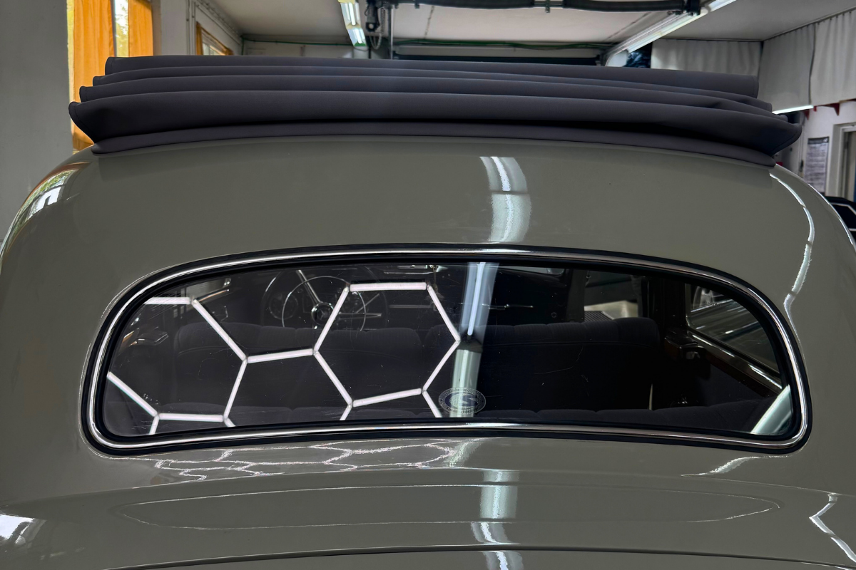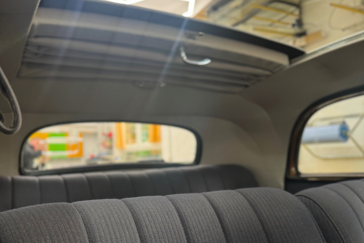 Der neue Faltverdeckbezug und der maßgefertigte Spannhimmel wurden individuell nach Originalvorlage gefertigt. Jede Naht sitzt exakt, die Spannung wurde perfekt abgestimmt und das Verdeck passgenau montiert. So fügt sich die Erneuerung nahtlos in die elegante Linienführung der Limousine ein und verleiht dem Oldtimer seine ursprüngliche Eleganz zurück.