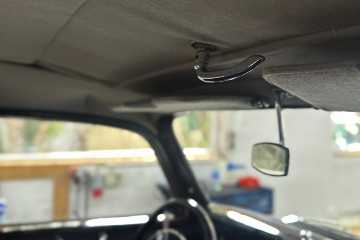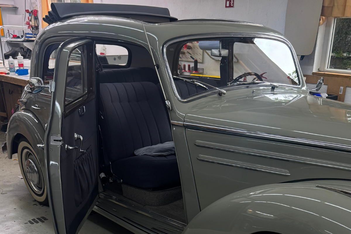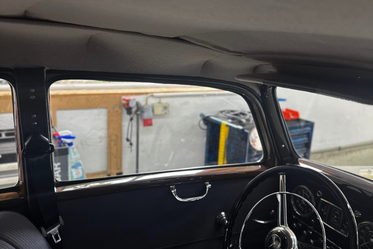 Mit der Erneuerung von Faltverdeck und Spannhimmel präsentiert sich der Mercedes-Benz Typ 187 220 Limousine wieder im nahezu neuwertigen Zustand – ein Beweis für detailgenaue Handwerkskunst in der Oldtimer-Restauration.
