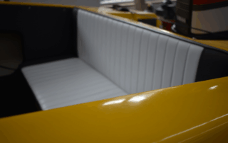 Eine besonders spannende Aufgabe stellte die Konstruktion der Rückbank dar. Diese sollte leicht entfernbar, gleichzeitig jedoch stabil genug sein, um den Erschütterungen auf dem Wasser standzuhalten. Mithilfe spezieller Halterungen und Lager aus der Marinetechnik konnte diese Herausforderung erfolgreich gelöst werden. Die Rückbank wurde anschließend in höchster Qualität gepolstert und präzise mit Marinekunstleder bezogen.